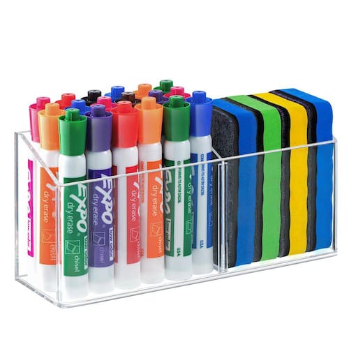 ?Divisória removível?Porta-canetas magnético de quadro branco atualizado para 2 salas com prateleiras móveis, que podem separar marcadores e borrachas para manter os objetos bem organizados de forma eficaz. Se você não precisar dessa divisória, poderá removê-la.
