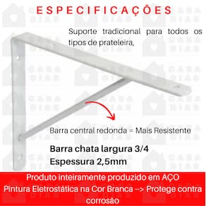 Suporte Mão Francesa Prateleira 15, 20, 25, 30, 35, 40, 50cm Cantoneira Reforçada Kit Com 2 Unidades Escolha o SeuSuporte com design tradicional e discreto ideal para qualquer tipo de ambiente e prateleira. Possui furos para fixação na parede e no objeto que se irá apoiar.QUALIDADE, RESISTÊNCIA E DURABILIDADESua pintura é eletrostática na cor branca o que garante qualidade e durabilidade além de ser um produto feito em aço, o que garante resistência e força suportando até 20kg.MULTIUSO E VERSÁTILPode ser usada para organizar vários tipos de objetos e utensílios, livros, porta retratos e permite combinação com outras prateleiras facilitando a organização, como por exemplo:*Cozinha e lavanderia > Você pode usar diversas prateleiras para formar uma dispensa na cozinha, ou guardar produtos de limpeza na lavanderia.*Quarto infantil > Você usa para organizar brinquedos infantis no quarto, ou mesmo produtos de uso diário (lenços umedecidos, fraldas, etc).*Quarto e Sala > Use para organizar livros, estatuetas, etc.O produto já vai pronto para instalar e enviamos o kit completo de fixação que inclui duas buchas e quatro parafusos por suporte, sendo dois maiores para a parede, e dois menores para a madeira não deslizar e ficar bem firme.CARACTERÍSTICAS:- Suporte na cor Branca- Pintura eletrostática >> não enferruja- Produzido em aço >> mais durabilidade- Barra diagonal soldada >> mais resistente- Mão Francesa ( REFORÇADA/PESADA )CONTEUDO DA EMBALAGEM- 2 X Mãos francesas 15cm ou 20cm ou 25cm ou 30cm ou 35cm ou 40cm ou 50cm- 4 X Parafusos 5,0 x 40mm- 4 X Parafusos 3,5 x 14mm- 4 X Buchas 8mm