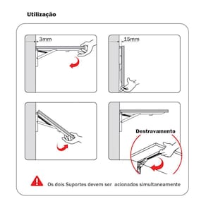 Mão francesa dobrável Para tampo de madeira (MDF, MDP, compensado, madeira natural). Podendo ser utilizado em todos os ambientes com os mais variados usos: mesa, balcão, aparador, escrivaninha, penteadeira, prateleira, etc. Produto ideal para aproveitamento de espaços reduzidos, tem a praticidade de só apertar o gatilho para fechamento sem muito esforço e assim descer o tampo.