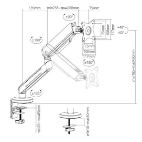 Especificações - sistema de elevação com pistão a gás. - giro de tela 360 paisagem / retrato . - rotação do suporte de 180. - altura máxima: 46 cm da mesa até o centro da fixação vesa . - altura mínima: 19 cm da mesa até o centro da fixação vesa . - ajuste de altura de até 27 cm. - carga máxima de 9 kg. - ajuste de inclinação da tela de +40 a -40.