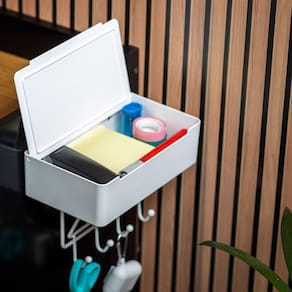 Organize seus pertences com praticidade e estilo usando o Organizador Multiuso Arthi Compartimentos inteligentes para lenços umedecidos, carteira, relógio e muito mais, além de 4 ganchos estrategicamente posicionados para pendurar chaves, vassouras e o que mais precisar.