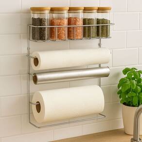Com design funcional e estrutura resistente, o suporte comporta três tipos de rolos (papel toalha, papel alumínio e plástico filme PVC) e ainda conta com uma prateleira superior para armazenar potes de temperos e condimentos com praticidade. A instalação é simples e o produto acompanha parafusos e buchas para fixação na parede, garantindo firmeza e segurança.