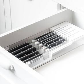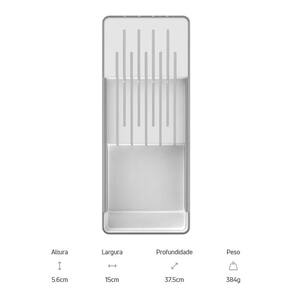 O organizador de facas foi pensado para permitir diversas composições e proporcionar máximo aproveitamento de espaço nas gavetas, por isso, comporta 9 facas sendo 5 facas grandes e 4 facas pequenas, além de divisórias que preservam o fio das facas. Combine, encaixe e enxergue facilmente o conteúdo, mantendo tudo em ordem.