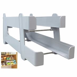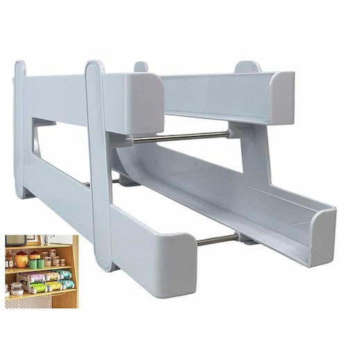 O organizador comporta até 8 latas padrao (350ml), proporcionando um armazenamento adequado para quem quer reduzir a desordem na geladeira. Conforme você retira as latas do andar inferior, as que estão no andar superior rolam para baixo.