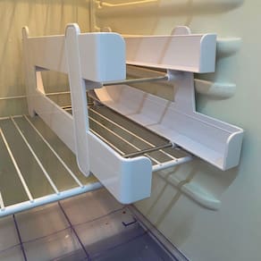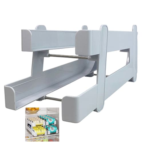O organizador comporta até 8 latas padrao (350ml), proporcionando um armazenamento adequado para quem quer reduzir a desordem na geladeira. Conforme você retira as latas do andar inferior, as que estão no andar superior rolam para baixo.