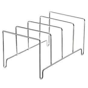 Organizador muito prático e versátil Serve para organizar: Tampas de panelas, formas, pratos, bandejas, etc. Dimensões: 16cm de largura 28cm de comprimento 14cm de altura Espaço entre as divisórias 6,5cm Material: Aço Cromado Imagens meramente ilustrativas, não incluso travessas e frigideiras Ean: 7897807418533