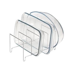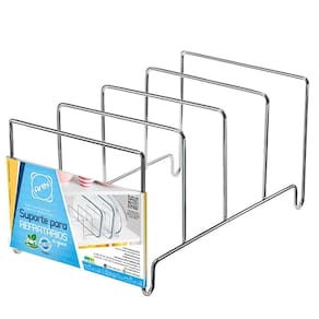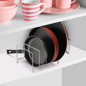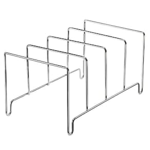 Organizador muito prático e versátil Serve para organizar: Tampas de panelas, formas, pratos, bandejas, etc. Dimensões: 16cm de largura 28cm de comprimento 14cm de altura Espaço entre as divisórias 6,5cm Material: Aço Cromado Imagens meramente ilustrativas, não incluso travessas e frigideiras Ean: 7897807418533