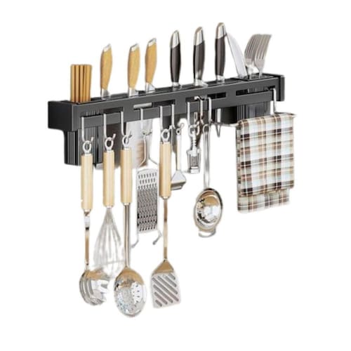 Especificações: - material: aço inox - medida: 50cm x 07cm x 06cm - espaço para talheres - espaço para facas - ganchos: 08 - cor: preto ===================================== Devido à diferença entre monitores e iluminação diferentes, pode haver variação na tonalidade apresentada no anúncio. Medidas muito aproximadas. Marca: Não Informado