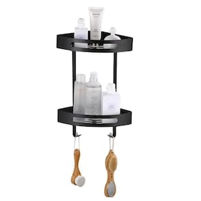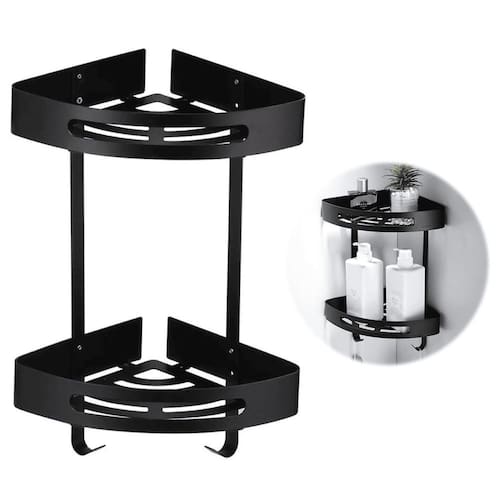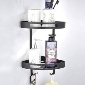 Cor: Preto Fosco Material: Alumínio de alta qualidade 2 prateleiras com capacidade para até 3kg cada Economiza espaço ao usar o canto da parede Design elegante e sofisticado, complementando a decoração do banheiro Resistente, feito para durar e suportar o uso diário Ganchos adicionais para pendurar esponjas ou outros acessórios