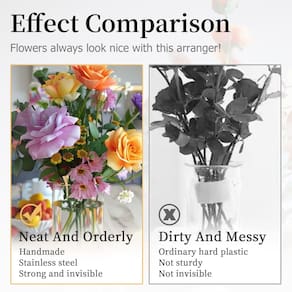 O suporte para arranjos de flores é feito de aço inoxidável e foi projetado para organizar e manter flores ou plantas no lugar.