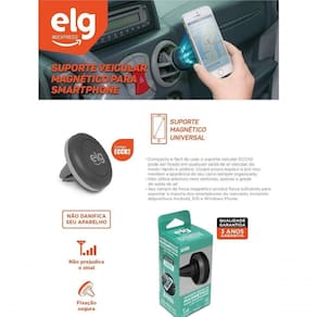 Cor: Preto Tipo: Suporte veicular Conector: Encaixe na saída de ar Extras: Fixação metálica, Giro 360, Livre de interferências, Não altera as funções , Toque suave Material: Polímero ABS Conteúdo da embalagem: 1 Suporte ELG ECCH2. 2 placas metálicas, uma para fixar entre a capa e outra adesivos 3M para aplicar direto no aparelho sem capa.
