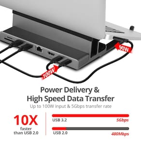 O CE-MTDK21-S1 é um suporte multifuncional para laptop e estação de ancoragem que oferece visuais de exibição 4K e várias conexões periféricas ao usar seu laptop, além de manter seu desktop bem organizado e eficiente em termos de espaço.