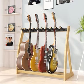 - ?Presentes perfeitos e de qualidade?Este suporte de bambu para várias guitarras é feito de bambu natural que tem um design elegante e uma superfície lisa. Pode ser utilizado em casa, no palco, em um bar ou em um estúdio de gravação. Este suporte de guitarra é menos propenso a arranhões e corrosão do que suportes de guitarra de metal ou madeira, por isso dura mais tempo. O suporte de guitarra para várias guitarras é um ótimo presente para os amantes de guitarra