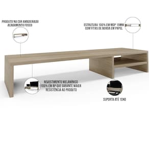 Organização, praticidade e são qualidades que definem o Suporte Para Monitor Stand Home Office Lap L03 Amadeirado - Lyam! Vem com a proposta de auxiliar você em suas horas de trabalho, estudos ou entretenimento em frente ao , pois ajuda a manter a tela na altura dos olhos, evitando dores na coluna e pescoço, garantindo uma melhor postura. Com acabamento impecável, possui revestimento melamínico que assegura maior resistência ao produto. Conta ainda com uma prateleira para que seus pertences mais importantes estejam sempre à mão e de fácil acesso, sua pegada Slim também merece destaque, por trazer modernidade ao ambiente e conversar super bem com a decoração. Não perca tempo e aproveite! Dimensões do produto (L x A x P) 89 x 15 x 25 cm Características: Estrutura 100% em MDP 15mm. Produto na cor Amadeirada, com acabamento Fosco. Fitas com borda de papel. Revestimento melamínico 100% em BP, que garante maior resistência ao produto. Suporta até 10Kg. Observações importante: - Produto entregue desmontado, acompanha manual de montagem. - Montagem com cavilhas e parafusos zincados. - A limpeza deve ser feita com pano levemente umedecido em água limpa, sem esfregar, não utilizar produtos abrasivos, desengordurantes, álcool ou solvente. - Produto para uso residencial em ambiente interno, não devendo ficar exposto diretamente ao sol, calor e umidade excessivos. - Pode haver alguma diferença de tonalidade entre a imagem e o produto real, por conta do tratamento de imagens e a calibração de cores do seu monitor. - As imagens são meramente ilustrativas, não acompanham objetos de decoração e eletrônicos. - Ao receber a mercadoria, o cliente deve verificar as condições da embalagem, caso haja alguma não assine o de e com nossa para orientações. - Montagem, desmontagem e outras instalações serão de responsabilidade do cliente. Não nos responsabilizamos, no ato da , por subir escadas/elevadores ou pelo por guincho em apartamentos. Eventuais despesas são de responsabilidade do comprador. - Confira as dimensões do produto e certifique-se de que passará normalmente por supostos elevadores, portas, escadas e/ou corredores de sua residência. Color: Madeira | ColorFamily: Madeira | ColorSimple: Madeira | ColorSupplier: Madeira | Material: MDP | MaterialFamily: MDP | Model: Lap | OriginCountry: | OriginState: PR | ProductContents: 01 Suporte para Monitor | ProductHeight: 15 cm | ProductInstructions: Produto para uso em ambiente interno, nao devendo ficar exposto ao sol, calor e umidade excessivos. | ProductLength: 25 cm | ProductWarranty: 90 dias após o do produto | ProductWeight: 5 kg | ProductWidth: 90 cm | SizeDescription: Altura: 15 cm Largura: 90 cm Profundidade: 25 cm | SupplierSimpleName: Suporte Para Monitor Stand Home Office Lap 90 cm L03 Amadeirado - Lyam