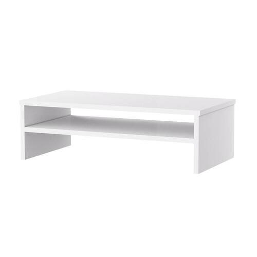 Apresenta um compartimento aberto na parte inferior, que é perfeito para armazenar teclados quando não estão em uso, livros, cadernos ou outros materiais de escritório, ajudando a manter sua mesa organizada e livre de desordem. A superfície superior é espaçosa o suficiente para acomodar o monitor de forma segura e estável, enquanto o design aberto contribui para uma sensação de leveza e amplitude no espaço de trabalho.