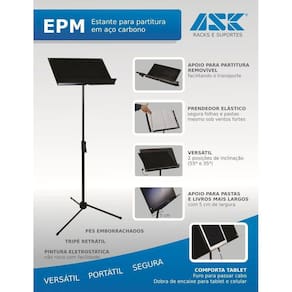 Suporte Para Partitura Maestro Epm Preto Ask O Suporte Para Partitura Maestro EPM é o apoio ideal para quem busca estabilidade, praticidade e uma boa relação custo-benefício. Destinado para tanto interno quanto externo, a estante EPM suporta pastas, partituras e até tablet/celulares. Com seu prendedor elástico, é capaz de segurar folhas e pastas mesmo sob ventos fortes assim como ser útil para outros s. A EPM ainda vem com duas opções de inclinação de 55 e 35 e apoio (mesa) removível para facilitar o transporte. Opção ideal para todos aqueles que desejam uma estante de partitura versátil, portátil e segura.Dimensões:Prancheta 400x250x250mm / Altura Ajustável de 1320mm (Máx.) Cor:Preto Material:Aço Carbono Pesquisa:suporte_para_partitura_epm_maestro_preto_ask_new