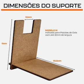Suporte para Pistolas de Cola de Largura até 31mm Modelo Pequeno - Marca Dremax - Modelo: Médio - Referência: DM-SP-02 - Altura: 11cm - Comprimento: 10,5cm - Abertura para Encaixe da Pistola: 31mm - Fabricado em MDF 2.8mm de espessura - Peso bruto: 50 gramas - Garantia: 90 dias Marca: Dremax