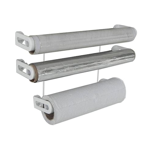Suporte para Papel Toalha e Rolos 3 em 1, em Aço Termoplastificado E Plástico. Acomoda 3 Utilidades: 1 Rolo De Papel E 2 Embaladores.Funcional, de fácil limpeza e rapida instalação, acompanha dois parafusos com buchas. Manter a cozinha e a bancada em ordem é possível com os itens corretos. O Suporte para Rolos - Suporte para Papel Toalha, papel Aluminio e Filme otimiza da melhor forma os espaços da cozinha, pois este produto é fixado na parede e a bancada fica livre e limpa. Dimensões:31 cm largura x 7,5 cm profundidade x 19 cm altura . Peso:1300 g. Material:Aço com revestimento termoplástico, plastico. Conteúdo:01 Suporte para Rolos - Suporte para Papel Toalha, papel Aluminio e Filme Cuidados especiais:Limpe com um pano umedecido, não utilize palhas de aço, podem danificar o produto causando arranhões. Marca: Não Informado