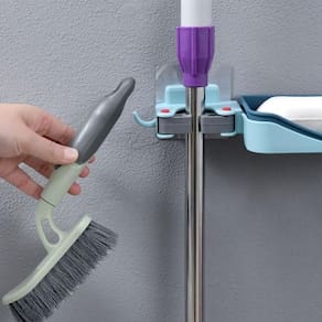O Suporte Para Sabonete, Vassoura e Rodo é uma ótima maneira de deixar seu banheiro, ou Lavanderia mais limpa e organizada. Ele possui dois apoios Emborrachados para rodos e vassouras, uma saboneteira com Revestimento removível, e ganchos nas laterais para apoiar outros Objetos do seu dia a dia. Sua fixação por suporte adesivo não vai Danificar a parede em que for colocada. É recomendado esperar 24 Horas após a instalação do suporte para utilizar.