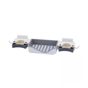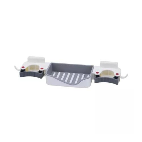 O Suporte Para Sabonete, Vassoura e Rodo é uma ótima maneira de deixar seu banheiro, ou Lavanderia mais limpa e organizada. Ele possui dois apoios Emborrachados para rodos e vassouras, uma saboneteira com Revestimento removível, e ganchos nas laterais para apoiar outros Objetos do seu dia a dia. Sua fixação por suporte adesivo não vai Danificar a parede em que for colocada. É recomendado esperar 24 Horas após a instalação do suporte para utilizar.