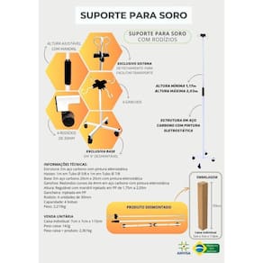O suporte para soro é indicado para ser em hospitais, em casa e clínicas. - Tripe estável - Base em X desmontável - Aço carbono com pintura eletrostática - Fabricado no Brasil, do fabricante O suporte com pedestal é feito de aço carbono, com 4 quatros ganchos. Tem altura ajustável por mandril de 1,75 a 2,03 m. tubular com 1 metro em 5/8 polegadas e 1 metro 7/8. Ficha técnica: Produto: suporte para soro com rodas Marca: Alo Ortopédicos Composição: estrutura em aço carbono, gancheira e mandril de PP injetado Peso: 2 kg Altura mínima: 1,75 m; Altura máxima: 2,03 m Fabricado no Brasil fornecida pelo fabricante Marca: Não Informado