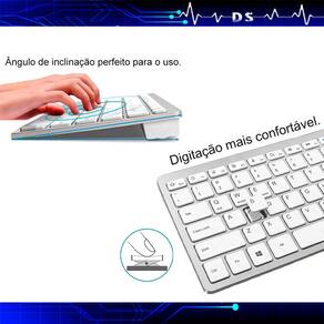 O Teclado Modelo Slim, pequeno, leve, resistente e ergonômico. Ideal para quem quer trabalhar com mais conforto, menos barulho de digitação, sem tirar nada do lugar, podendo usar à distância de até 10 metros, via Bluetooth.