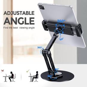 Lucrave Suporte de tablet para mesa, base rotativa de 360° ajustável, de alumínio, portátil, dobrável, base para casa, escritório, acessórios de mesa Rotação de 360°: A base giratória de 360° e o suporte para tablet combinados com um braço dobrável oferecem ajuste incomparável para digitar ou exibir sem perder nenhum ângulo de visualização. Flexível: A base giratória de 360° combinada com um braço longo de metal de 28 cm oferece ajuste incomparável para digitar ou exibir. Equipado com uma chave Allen, é fácil ajustar a resistência do braço do suporte. O clipe de silicone e o gancho de borracha suportam o seu tablet de forma suave, mas firme, protegendo o tablet de deslizar e evitando arranhões. Suporte resistente para iPad: Feito de material de liga de alumínio completo, juntamente com uma base mais grossa e maior e um design de centro de gravidade, este suporte de iPad para mesa ajustável visa alcançar estabilidade e durabilidade superiores. Em comparação com o suporte de tablet comum para mesas usando plástico, ele oferece suporte 10 vezes mais estável sem agitação, o que é muito adequado para tablets de tamanho grande, como o suporte para iPad Pro 13. Design ergonômico e elegante: Complementa seus dispositivos de tecnologia moderna com este suporte elegante para iPad. Braços longos e curtos flexíveis e ajustáveis, satisfaz o design ergonômico e atende a qualquer ângulo necessário. Visão ao nível dos olhos e melhor postura. É um bom parceiro de trabalho se você usar o iPad como uma tela estendida. Além disso, a base para tablet pode ser adequada para cozinhar, reuniões, estudar etc. Ampla compatibilidade: Este suporte universal extensível para tablet é aplicável a dispositivos de 15 a 33 cm. A embalagem inclui: 1 suporte Lucrave Tablet. Serviço cuidadoso: Nós nos preocupamos sinceramente com a experiência de compra de cada cliente. Qualquer problema, diretamente com a Lucrave para obter uma solução satisfatória. - Rotação de 360°: o suporte para iPad combinado com um braço dobrável oferece ajuste incomparável para digitar ou exibir sem perder nenhum ângulo de visualização. Nosso suporte giratório de 360° para iPad pode virar rapidamente a tela entre você e seus parceiros ou alternar o modo paisagem/retrato. - Flexível: o suporte giratório para iPad de 360° combinado com um braço longo de metal de 28 cm oferece ajuste incomparável para digitar ou exibir sem perder nenhum ângulo de visualização. O suporte para tablet com chave Allen é fácil de ajustar a resistência do braço do suporte. O clipe de silicone e o gancho de borracha suportam o seu tablet de forma suave, mas firme. - Suporte resistente para iPad: feito de material de liga de alumínio completo, juntamente com uma base de suporte de iPad 360 mais espessa e maior e um design de centro de gravidade, este suporte de iPad ajustável para mesa visa alcançar estabilidade e durabilidade superiores. Em comparação com o suporte de tablet comum para mesa usando plástico, ele oferece suporte 10 vezes mais estável sem agitação, o que é muito adequado para tablets de tamanho grande, como o suporte para iPad Pro 13. - Design ergonômico e elegante: complementa seus dispositivos de tecnologia moderna com este suporte de iPad de rotação 360 com aparência elegante. Braços longos e curtos flexíveis e ajustáveis, satisfaz o design ergonômico e atende a qualquer ângulo necessário. Visão ao nível dos olhos e melhor postura. É um bom parceiro de trabalho se você usar o iPad como uma tela estendida. Além disso, a base para tablet pode ser adequada para cozinhar, reuniões, estudar etc. - Ampla compatibilidade: este suporte universal extensível para tablet é aplicável a dispositivos de 15 a 33 cm, compatível com todos os dispositivos de 4,7 a 13 polegadas, como iPad Air 13, iPad Pro 13, iPad 10ª geração, iPad Air 5 4, iPad 10.2, iPad Pro 11 12,9, iPad mini 6 5, Samsung Tab S6 S5e, iPhone 11 5 15 Pro, 15 Pro Max e mais. O suporte é adequado para capas protetoras grossas e pode ser utilizado diretamente mesmo se o dispositivo vier com uma capa resistente. - O pacote inclui: Suporte giratório 360 para tablet base com braço de suporte x 1, clipe de tablet para celular x 1 chave Allen x 1.