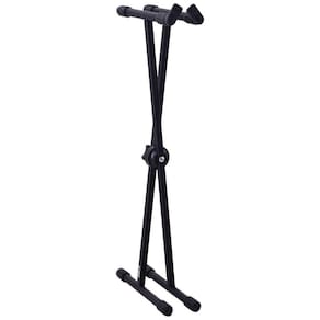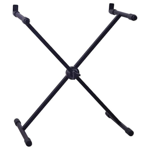 Suporte para teclado x10 preto O suporte para teclados x10 possui estrutura em "x" com regulagem de altura, base e apoios em ferro e pintura eletrostática Menor que o x30, geralmente é usado na posição sentado, leve e pratico Capacidade 15 kg Peso 2,6 kg Dimensões comp. 43; alt. 92; larg. 12 cm