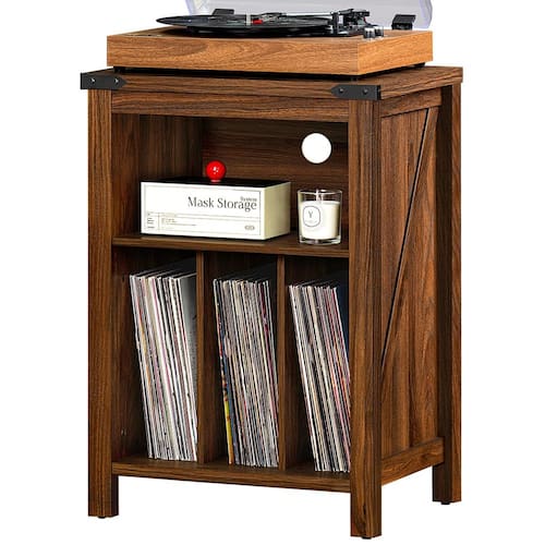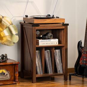 - ?Suporte de discos vintage?Este armazenamento de discos combina uma estrutura de madeira maciça com um estilo clássico de casa de fazenda, criando um glamour único. O armário do toca-discos retém a textura natural autêntico ao máximo, tornando a textura da mesa de discos mais avançada. Para proteger as bordas do corpo do gabinete, usamos protetores de canto de metal atraentes.