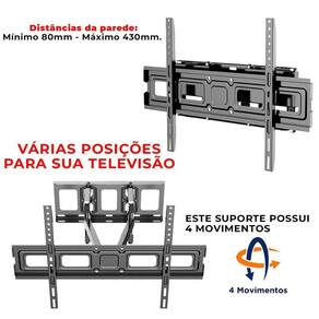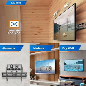 Suporte para TV Articulado Multiarticulado 37 a 80" TV's Led, Lcd, Oled, QLed SAV-4600 O Suporte para TVs Multiarticulado é o produto mais completo da linha;garante total segurança para televisores maiores, com movimentos em 4 direções enquanto ainda está preso na parede;Você pode girar na horizontal e também fazer ajustes de inclinação, seja para cima ou então para baixo;Compatível com televisores de tela LCD, LED, OLED, QLED e Plasma, de 37" a 80" polegadas pelo padrão VESA;foi desenvolvido para ter uma instalação prática enquanto garante alta segurança e organização para seu equipamento.Onde posso fixar meu suporte? em painéis de madeira e paredes Dry Wall você precisa verificar a resistência se é resistente o suficiente.Acessórios e Kit de instalação;Além do Kit de instalação completo, que conta com parafusos, buchas e arruelas pra vários tipos de superfícies;acompanha o nível tipo bolha do próprio suporte, assim você saberá facilmente se está reto o suficiente pra fazer a furação;acompanha organizador de cabos, o próprio suporte consegue esconder seus fios na parte interna ao prender com o organizador.Características:Modelo: SAV-4600;Padrão VESA (MM) 200x200200x300300x200300x300400x200400x300400x400600x200600x400;Local de Instalação: Alvenaria, painel de madeira e MDF, Dry Wall;Polegadas Suportadas: 37 a 80" Polegadas;Instalação do suporte: Vem pré montado - Fácil instalação;Material: Aço Carbono com pintura resistente, epóxi eletrostática (anticorrosiva);Distância minima da parede: 80 mm;Distância máxima da parede: 430 mm;Peso máximo suportado: 40 Kg;Peso do produto: 3,9 Kg. Ean: 2010000039816