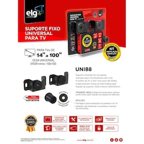 O Suporte para TV Universal ELG UNI88 foi desenvolvido para oferecer máxima segurança, durabilidade e praticidade na instalação de televisores de diferentes tamanhos e modelos. Compatível com TVs planas e curvas de 14 a 100 polegadas, ele suporta até 100 quilos de peso, garantindo firmeza e estabilidade para televisores de grandes dimensões. Produzido com materiais de alta qualidade como aço carbono e nylon, o UNI88 oferece resistência mecânica e acabamento refinado, combinando robustez com um design moderno e funcional. Sua estrutura foi projetada para atender ao padrão internacional de furação VESA, variando de 100x100 a 800x400 milímetros, o que abrange a maioria dos televisores disponíveis no mercado. Essa versatilidade assegura que o suporte possa ser utilizado em residências, empresas, auditórios, bares, restaurantes e qualquer ambiente que necessite de uma fixação de confiança.