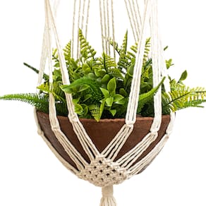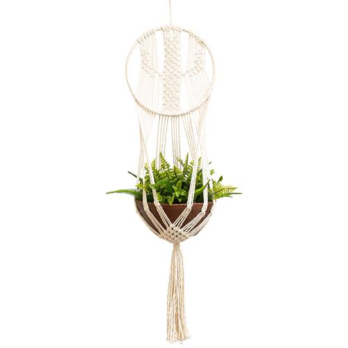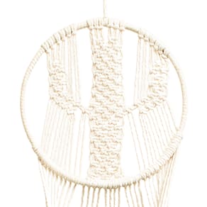 Informações técnicas: - Material: fios de Algodão cru de 4mm; - Aro: Metal de 28 cm de diâmetro; - Suporta vasos de até 30 cm de diâmetro; - Dimensões 85 cm (comprimento pode apresentar pequena variação - Peso: 160g; - Cor: Bege (Cru)