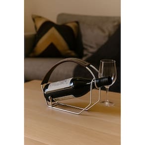 Momentos românticos pedem um bom vinho. Impressione na arte de servir com um suporte cromado com acabamento em couro, de alta qualidade e fácil limpeza.