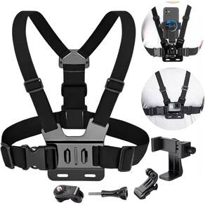 Suporte peitoral ajustável com alças elásticas para fixação segura em atividades que exigem mãos livres. Inclui suporte tipo J, adaptador universal, parafuso de fixação e suporte de celular com ajuste de rosca.Vendido e entregue por ACADEMIA DA COMPRA