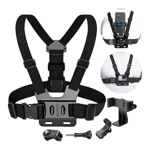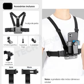 Suporte peitoral ajustável com alças elásticas para fixação segura em atividades que exigem mãos livres. Inclui suporte tipo J, adaptador universal, parafuso de fixação e suporte de celular com ajuste de rosca.