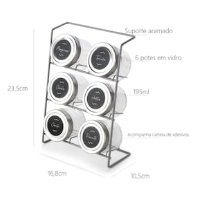Composição do produto: 6 Potes em vidro 195mL 6 Tampas em alumínio 1 Suporte em aramado 1 Cartela com 24 adesivos