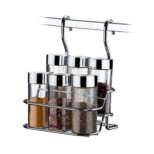 O conjunto é composto por um suporte e 6 vidros. Tenha praticidade no seu dia a dia com produtos funcionais. Pode ser usado em barras tubulares ou de perfil chato.