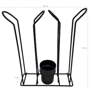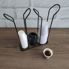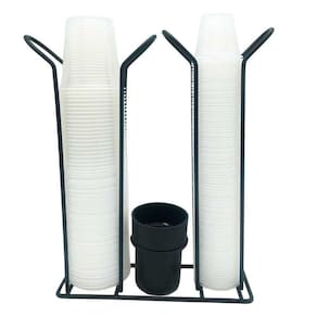 Suporte Porta Copo Descartável 50 80ml e 180 200ml Organizador de Copos e Colheres Café Preto Fosco Stolf #Organização na hora do café #Otimizando o espaço #Linha Black Garantia: 90 dias / Peso: 388g / Cor: Preto Fosco / Ref: 1459BLPSTD Dimensões: 25cm (C) x 7cm (L) x 28cm (A). Tamanho pote redondo: 6cm (D) x 7,5cm (A). Espessura do aço: 5mm. Abertura para copo 50 80ml: 4cm Abertura para copo 180 200ml: 5cm Cuidados: Não lavar com materiais abrasivos. Material: - Plástico; - Aço pintado. Esse suporte acomoda tamanhos diferentes de copos descartáveis, ideal para quem possui pouco espaço mas não abre mão do cantinho do café. O organizador de copos conta também com espaço para mexedores e colheres. Sua bancada sempre organizada e linda com o suporte de copo para mesa.