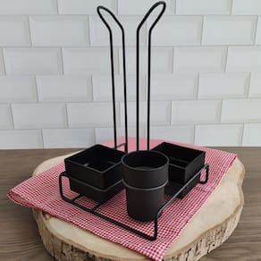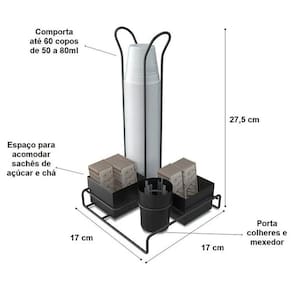 Suporte Porta Copos Descartáveis 50 E 80ml Organizador Porta Sachês Colheres Açúcar Stolf Preto. #Organizador de saches, colheres e copos #Conjunto organizador para café chá #Linha Organização Black Stolf Garantia: 90 dias / Peso: 380g / Cor: Preto Fosco / Ref: 1457BLPSTD Dimensões: 17cm (C) x 17cm (L) x 27,5cm (A) Dimensões do pote redondo: 6cm (D) x 8cm (A) Dimensões dos potes quadrados: 7cm (C) x 7cm (L) x 6cm (A) Espessura do aramado: 4mm Conteúdo: - 01 Suporte aramado para copos descartáveis; - 01 Potinho redondo para colherinhas; - 02 Potinhos quadrados para sachês. Cuidados e limpeza: - Lave com pano levemente umedecido com água, seguido de pano seco; - Não utilizar produtos químicos ou abrasivos na limpeza; - Evitar batidas e o contato com objetos cortantes; - Não vai a lava-louças. Detalhes do produto: - Comporta até 50 copos de 50ml ou 80ml, com diâmetro de até 4,5cm. Materiais: - Polipropileno; - Aço carbono. A pausa para o café tem um parceiro perfeito: o conjunto organizador para chá e café da linha Black Stolf que armazena copos descartáveis, mexedores, sachês e adoçantes. O suporte organizador comporta até cinquenta copos de 50 ou 80ml, com diâmetro de até 4,5cm. Com design aramado o organizador de copos dispõe de acabamento em exclusivo em pintura acetinada na cor preto fosco, garantindo um acabamento moderno, além de maior resistência contra ferrugem.