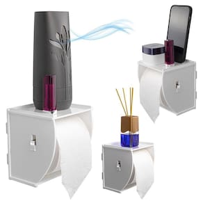 O design minimalista do suporte é focado em otimizar o espaço e a funcionalidade. Na parte superior, há uma superfície plana onde você pode apoiar itens como celular, aromatizadores de ambiente ou outros objetos, com capacidade de suportar até 2kg.
