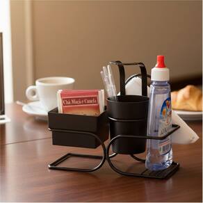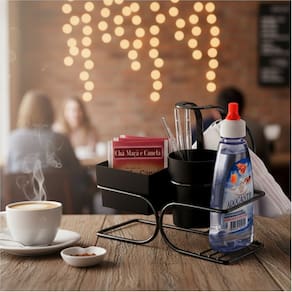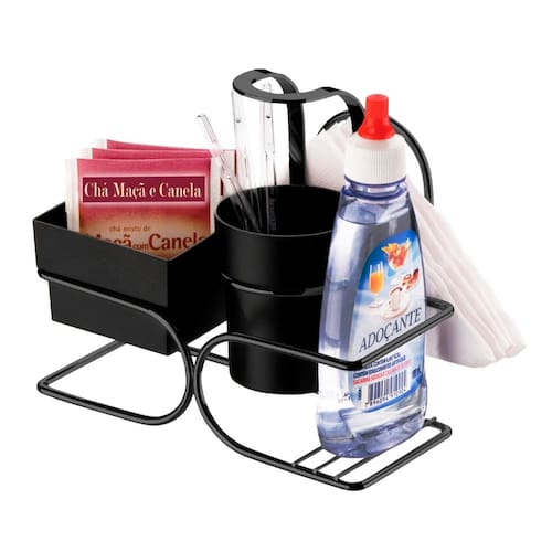 - Possui recipientes para armazenar sachês e mexedores;
