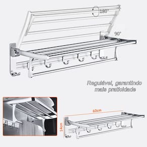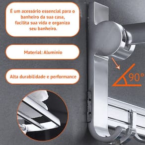O produto tem como diferencial, 5 ganchos extras para pendurar toalhas, buchas de banho. Os ganchos são totalmente ajustáveis.
