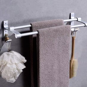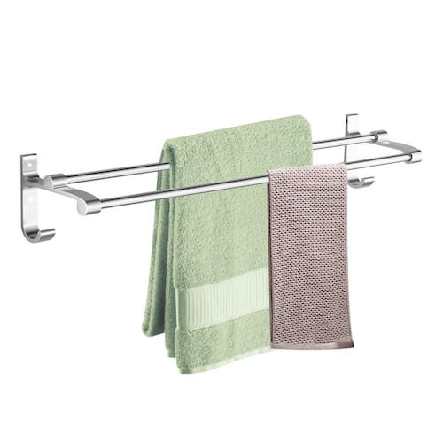 O suporte de porta-toalha de banho duplo, também conhecido como toalheiro de parede duplo, é um acessório utilizado para pendurar e organizar toalhas de banho no banheiro. Ele é projetado para ser fixado na parede, oferecendo um local conveniente e prático para armazenar as toalhas de forma organizada.
