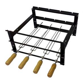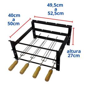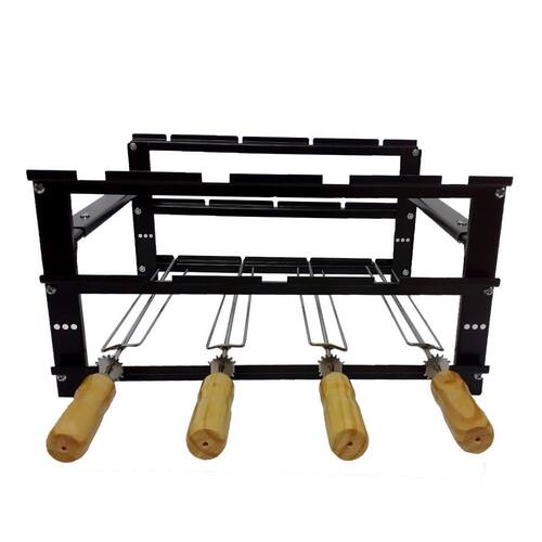 O Suporte Kit 4 Esp - Preto Extremamente prático e resistente, ele é o equipamento ideal para o preparo de carnes, frango, cortes grandes como costela e até mesmo vegetais. Com estrutura toda em Aço Carbono, tem capacidade para acomodar 4 espetos.É ideal para garantir a qualidade do seu churrascoTodos os espetos possuem cabos de madeira natural, não superaquecem para maior conforto e segurança no preparo de seu churrasco.Com 4 espetos é possível realizar um churrasco para até 10 Pessoas. Dimensões:Altura: 27 cmProfundidade: 40 a 50 cmLargura: 49,5 a 52,5 cm Peso: 3,545 kg