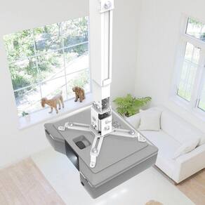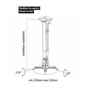 Indicado para projetores que permitam fixação através de 03 ou 04 pontos roscados e com peso até 20kg. Abrangência de fixação: O afastamento entre os pontos roscados presentes no projetor deve estar entre os limites de 225 até 315 mm (diâmetro) para que possam ser alcançados pelas hastes do suporte.