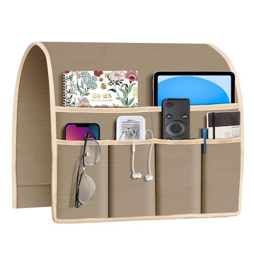 O suporte remoto Armrest Organizer para cadeirinha reclinável -?Material premium?O suporte de controle remoto Joywell é feito de uma ótima seleção de tecido de linho de 500 g/m2 e é projetado com uma trama firme de acabamento em duas camadas. Em comparação com outros suportes de sofá, será mais durável e mais espesso. Também é resistente a rugas, resistente à cor e à prova de encolhimento -?Handy Pockets?6 bolsos do organizador de apoio de braço foram projetados para suas necessidades. Você pode colocar jornais, revistas, iPad e tablet nos dois maiores bolsos, controles remotos, óculos, telefones celulares e outros dispositivos portáteis nos quatro bolsos padrão e mantê-los à mão sempre que precisar -?Amplamente aplicável?Este suporte remoto ajustável para sofá cabe em qualquer tamanho de apoios de braços no sofá, sofá, poltrona reclinável, mesmo pendurados na parede, mesa e cabeceira. Portanto, é realmente adequado para vários lugares, como sala de estar, quarto, escritório e quarto de hotel. O suporte multicolorido atende às suas necessidades de diversos estilos domésticos -?Função múltipla?O suporte de braço não é apenas conveniente para você guardar coisas diárias ao seu alcance, mas também evita que seu valioso apoio de braço do sofá seja arranhado e sujo por animais de estimação -?Fácil de cuidar e instalar?Nosso suporte de cadeira reclinável é lavável à máquina, de excelente qualidade faz com que possa ser utilizado por muito tempo. Coloque a extremidade do suporte do controle remoto embaixo da almofada do sofá e, em seguida, passe a outra extremidade ao redor do apoio de braço do sofá para que a mão possa pegar o conteúdo do bolso. O organizador do apoio de braço do sofá nunca deslizará com a extremidade pressionada