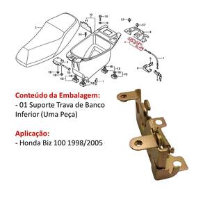 Suporte Trava Banco Inferior Biz 100 1998 - 2005 O Suporte Trava de Banco Inferior, é uma peça essencial para garantir a fixação segura do banco da sua Honda Biz 100, modelos de 1998 a 2005. Com qualidade superior, ele restaura a funcionalidade do sistema de travamento, proporcionando segurança e confiança no dia a dia. Conteúdo da Embalagem: - 01 Suporte Trava de Banco Inferior Uma Peça