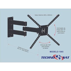 Atenção: se você deseja um outro modelo deste suporte que: Articule mais, ou ainda que fique mais próximo ou mais distânte da parede, nesta mesma página, rolando o mouse para baix0, em anúncios do vendedor você verá uma vasta opção onde poderá escolher o que atende melhor as suas expectativas.Este modelo permite até 8 tipos de movimentos diferentes. Inclina até 16 para cima ou para baixo e articula até 180º na horizontal, para ambos os lados.Desenvolvido para ser utilizado em aparelhos no padrão vesa de instalação, de led / lcd / plasma / 3d / 4k e ou smart tv, de 10 a 65 polegadas, com furação traseira de 100x100 até 400x400mm.Distância da parede: mínimo 70, máximo 460mmProduzido em aço de alta qualidade, com acabamento em pintura eletrostática epóxi .Suporta aparelhos com até 45 kgs.Fácil de instalar.5 anos de garantia.Já vem pré montado.