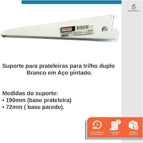 CARACTERÍSTICAS TÉCNICAS: Material: Aço pintado Medidas: 190mm base prateleira x 72mm base parede Espessura da chapa: 2mm Peso suportado: 60kg Distância entre os encaixes horizontalmente : 1cm Marca: Starfer Ref.: 13040702 Ean: 7891638998455