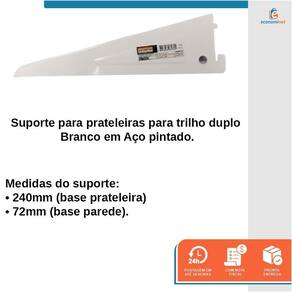 CARACTERÍSTICAS TÉCNICAS: Material: Aço pintado Medidas: 240mm base prateleira x 72mm base parede Espessura da chapa: 2mm Peso suportado: 60kg Distância entre os encaixes horizontalmente : 1cm Marca: Starfer Ref.: 13040710 Marca: Não Informado Ean: 7891638060602
